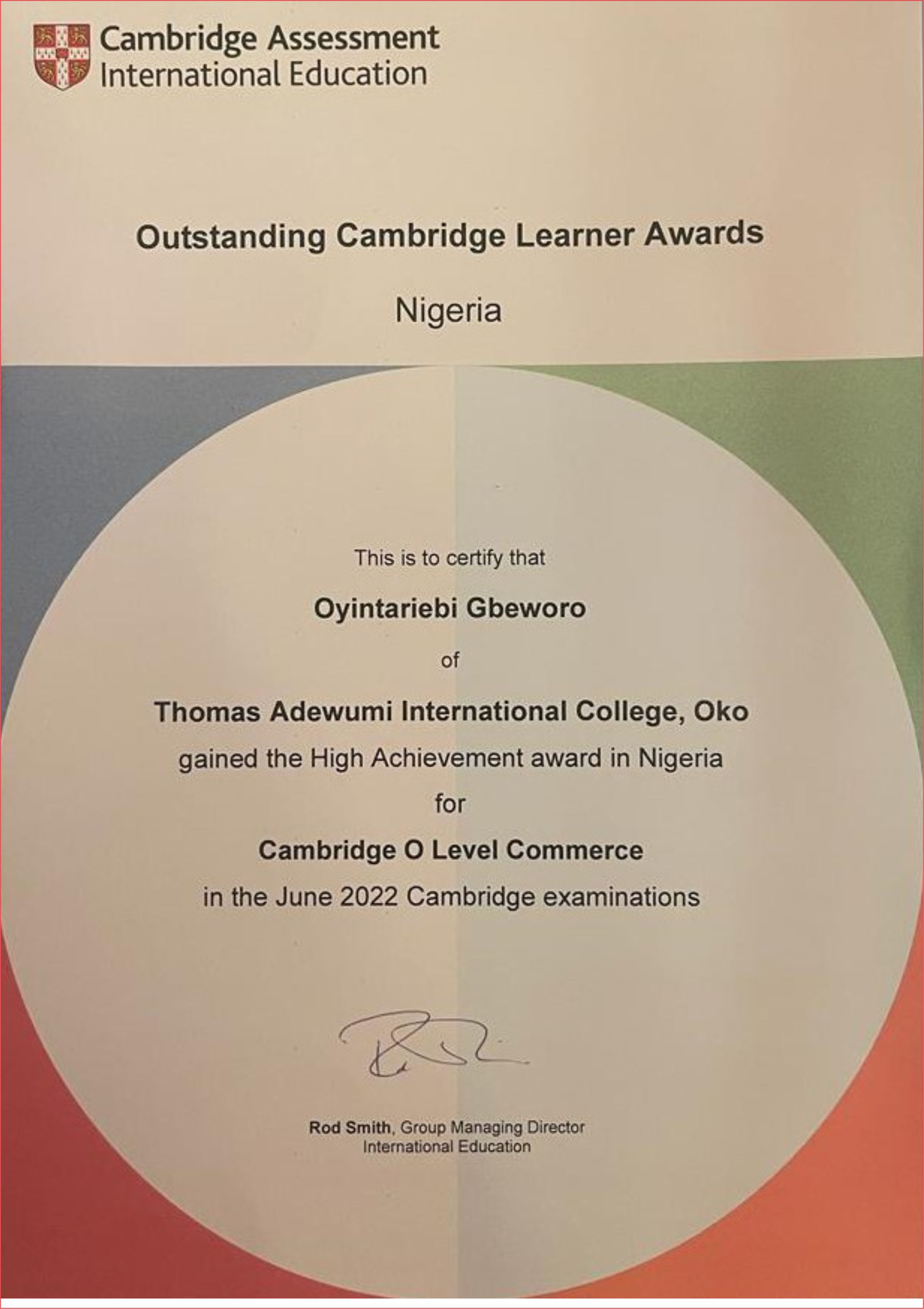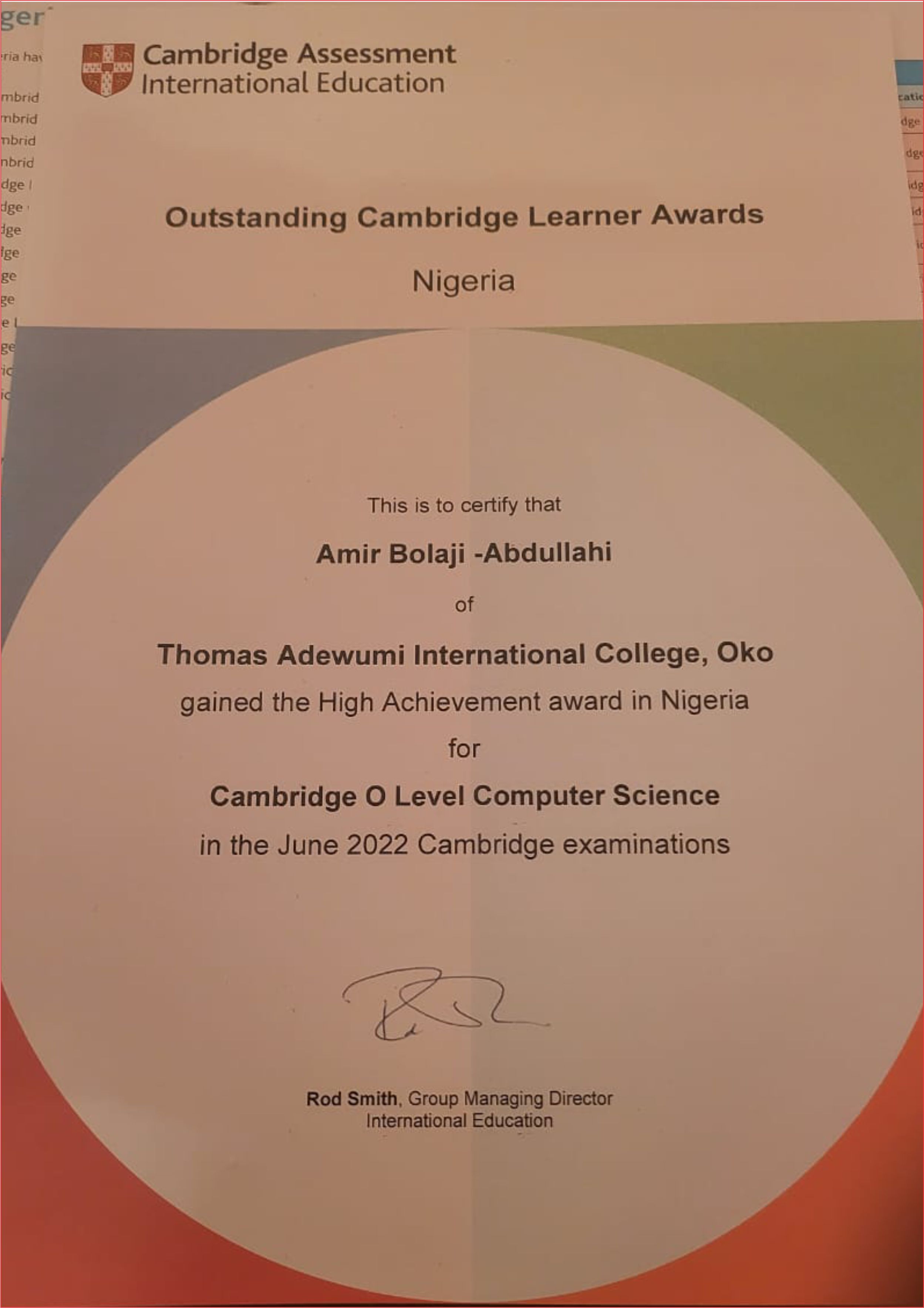 We extend our heartfelt congratulations to Gbeworo Oyintariebi and Bolaji - Abdullahi Amir for their remarkable achievement in the 2022 Cambridge Assessment International Examination. They have been honoured with The British Council High Achievement Award, having attained the highest scores in Commerce and Computer Science respectively.